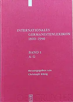 - ↑ Vgl. Espagne, Michel: Internationalität einer »deutschen Wissenschaft« [Rezension über: Christoph König (Hg.): Internationales Germanistenlexikon 1800–1950. Walter de Gruyter 2003], in: IASL online, Tübingen: Niemeyer, 16. Juli 2004. Online unter: http://www.iaslonline.de/index.php?vorgang_id=795 [Zugriff am 7. Oktober 2022].