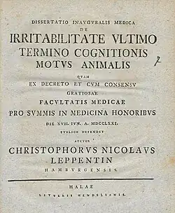 - Dissertatio Inauguralis Medica De Irritabilitate Ultimo Termino Cognitionis Motus Animalis. Universität Halle (Saale), 1771. (Online)