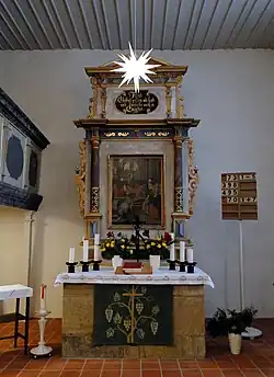 Der Altar ist aus Holz geschnitzt und eine „derbe handwerkliche Arbeit“.[3] Er ist 200 Zentimeter breit und 250 Zentimeter hoch. Auf dem durchgehenden, flachen Sockel sind die Worte „komt her zu mir!“ zu lesen. Der Altaraufbau ist im Vergleich zum Sockel verhältnismäßig hoch. Über dem Sockel schließen sich auf Postamenten seitlich dorische Säulen an, die sich im Gebälk verkröpfen. Seitlich der Säulen schließen den Aufsatz Rollwerkanläufe ab, die aus ausgeschnittenen Brettern hergestellt wurden. Ein gesprengter Dreiecksgiebel bildet den oberen Abschluss, der seitlich ebenfalls Rollwerk aufweist.