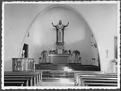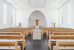 Nach dem Konzept einer Wegekirche wurden die liturgischen Orte des Raums auf den Altarraum, der ein einheitliches Niveau erhielt, hin ausgerichtet. Mittig unter dem Parabelbogen befindet sich der Altar, in dessen Achse, mittig im Kirchenschiff, sich der Taufstein befindet. Der Tabernakel fand seinen Platz in einer Art Sakramentskapelle.