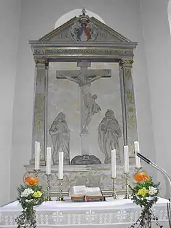 • Der Altar ist eine Schöpfung der Spätrenaissance; er wurde 1599 in Kalkstein gefertigt. Von 1886 bis 1958 ersetzte ihn ein neugotischer Altar mit einem Gemälde der „Bergpredigt“ des Nürnberger Kunstmalers Rall. Der 1958 wieder aufgestellte ursprüngliche Altaraufsatz besteht aus zwei ionischen Pfeilern mit flachem Beschlägwerk, die einen Architrav tragen, der mit einem Dreiecksgiebel mit dem Wappen derer von Absberg und der Jahreszahl „1599“ abschließt. In dem von den Pfeilern gebildeten Feld steht ein Kruzifix mit Maria und Johannes – eine „sehenswerte Kreuzigungsgruppe“.[15] Auf der Predella ist in lateinischer Sprache ein Spruch aus dem 53. Kapitel des Buches Jesaja angebracht.[16]
