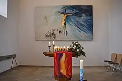 Zur Jahrtausendwende wurde der Innenraum der Kirche neu gestaltet, und hier vor allem der Altarraum. Der Altar, der Taufstein und das Kruzifix an der Wand wurden entfernt. Stattdessen ersetzte man sie durch einen achteckigen Volksaltar aus Holz, in den die Taufschale mit eingearbeitet ist. An der Wand fand ein neues Altarbild vom ortsansässigen Künstler Martin Kiss seinen Platz - ein großformatiges Gemälde "Der gekreuzigte Christus". Das Kruzifix wurde umgestaltet, indem man Korpus und Kreuz voneinander trennte. Der Korpus fand seinen neuen Platz an der Wand auf der Empore.