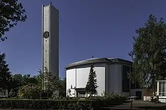 | Baustil | flachgedeckter Putzbau im Stil der Moderne, Stahlbetonskelettbauweise, eingeschossiger Sakristeianbau, freistehender Glockenturm |