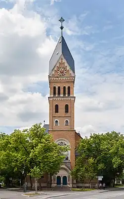Die Stadt hatte seinerzeit nur den Baugrund der Kirche geschenkt, sodass die Außenanlagen um die Kirche mit dem baumbeschatteten Martin-Luther-Platz noch immer städtisch sind. An der Ostseite der Kirche ragt über dem doppeltürigen Eingang der 36 m hohe neuromanische Kirchturm empor, der Helm ist im Stil romanischer Kaiserdome gestaltet.