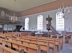 Das Kirchenschiff ist ein einfacher Rechteckbau mit vier Fensterachsen und einem Schopfwalm- bzw. Krüppelwalmdach. Östlich an das Kirchenschiff angebaut ist ein Turm mit quadratischer Grundform. Der Innenraum mit Kanzel und Altarschranken aus der Erbauungszeit ist ein typisches Beispiel für eine calvinistisch-nüchterne Betsaalkirche.[2]