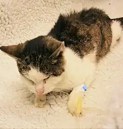 Die Möglichkeiten der Nierenersatztherapie sind bei Katzen stark eingeschränkt, da Nierentransplantationen[34] oder Hämodialyse[35] in der Tiermedizin aufgrund des hohen apparativen, logistischen und finanziellen Aufwands nur in Ausnahmefällen durchgeführt werden. Ziel ist es daher, eine chronische Nierenerkrankung in einem möglichst frühen Stadium zu erkennen, in dem die Niere noch ausreichend Reservekapazität hat. Gleichzeitig wird versucht, über diätetische Maßnahmen die Menge der harnpflichtigen Stoffe – vor allem Stickstoffverbindungen und Phosphat – in der Nahrung zu reduzieren. Schließlich müssen Stoffwechselentgleisungen und Folgeerscheinungen abgepuffert werden. Ab einem Plasmakreatininspiegel von 7 mg/dl (618,8 µmol/l) ist die medikamentöse Therapie jedoch wenig erfolgversprechend.[32]