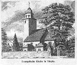 Die älteste urkundliche Erwähnung in der Schreibweise „Tyrpicz“ datiert vom 30. November 1292. Türpitz hat vermutlich bald nach Gründung des Orts gegen Ende des 13. Jahrhunderts eine Kirche erhalten, jedenfalls ist sie bereits im Jahre 1335 nachweisbar. Die Reformation wurde in Türpitz schon früh eingeführt, seit 1534 ist der Ort ohne Unterbrechung evangelisch geblieben. Auch in der Zeit der Gegenreformation konnte Türpitz unbehindert am evangelischen Bekenntnis festhalten. Zur Kirchengemeinde gehörten früher auch die Ortschaften Algersdorf, Berzdorf und Pleßguth (sämtlich im Kreis Münsterberg gelegen), sowie das Gut Wilme, Kreis Strehlen. Das Patronat ruhte bis 1945 auf dem Rittergut Türpitz, das Kompatronat auf dem Gut Wilme.