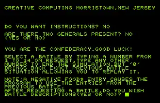- ↑ David H. Ahl, Civil War in BASIC Computer Games - Microcomputer Edition, S. 46, Creative Computing Print, 1978, ISBN 0-916688-07-0