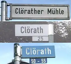 Auf wessen Gebiet man sich gerade befindet, erkennt man in Clörath im Zweifelsfall am Design der Straßenschilder. Die obige Abbildung zeigt, von oben nach unten, je ein Viersener, ein Willicher und ein Tönisvorster Straßenschild.