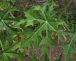 Die einfachen und gestielten Laubblätter sind wechselständig und gehäuft an den Zweigenden angeordnet. Der kahle bis borstige Blattstiel ist bis 6–30 Zentimeter lang und es können im oberen Teil Drüsen vorhanden sein. Die fast kahle bis borstige, ganzrandige, im Umriss breit-herz- bis pfeilförmige, etwa 15–30 Zentimeter große, papierige Blattspreite ist mehr oder weniger 3–7-fach handförmig gelappt bis zerschnitten. Die spitzen bis zugespitzten Lappen sind ganz bis mehr oder weniger gelappt bis geteilt und/oder grob bis fein gezähnt. Die Nervatur ist handförmig. Die kleinen Nebenblätter sind sehr früh abfallend.