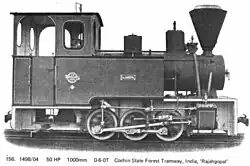 | O&K 2603 | Sep. 1907 | 50 PS | 1000 mm | C n2t | Holz | Conservator of Forest, Cochin State | ||