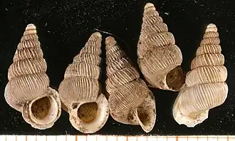 Das rechtsgewundene Gehäuse ist 9 bis 12 mm hoch und 4,5 bis 6 mm breit. Der Apex des Gehäuses ist oft trunkiert. Es besitzt neun Windungen; die obersten zwei bis drei Windungen sind bei erwachsenen Tieren leer und werden oft abgeworfen. Wenn sie vorhanden sind, sind sie glasartig glänzend und durchsichtig. Die Oberfläche ist mit kräftigen, scharfen und gleichartigen Rippen bedeckt. Sie sind regelmäßig angeordnet und stehen ziemlich dicht. Die leicht schief stehenden, aber kaum gebogenen Rippen fehlen nur auf den Embryonalwindungen, und stehen auf der Endwindung etwas weiter.