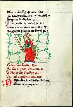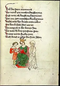 - ↑ Die Angaben in diesem Abschnitt folgen, wenn nicht anders vermerkt, der Beschreibung von Karin Zimmermann: Cod. Pal. germ. 14. In: Die Codices Palatini germanici in der Universitätsbibliothek Heidelberg (Cod. Pal. germ. 1–181). Wiesbaden 2003, S. 38 (Digitalisat; abgerufen am 22. März 2020).