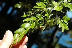 Die wechselständig und zweizeilig bis spiralig am Zweig angeordneten Laubblätter besitzen einen 3–9 mm langen Blattstiel. Die einfache, etwas ledrige, steifliche, bis auf den Mittelnerv kahle, kleine und spitze bis stumpfe Blattspreite ist mit einer Länge von 2–4 cm und einer Breite von 1–2 cm eiförmig bis elliptisch und drüsig punktiert mit einer spitzen bis abgerundeten Spreitenbasis. Der Blattrand ist ungleich gesägt bis gekerbt. Es sind Nebenblätter vorhanden.