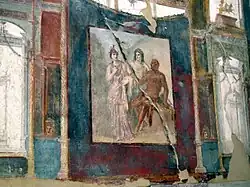 Es ist unsicher, welche Gottheit im Allerheiligsten verehrt wurde. An den beiden Seitenwänden des Heiligtums befinden sich großfigurige Malereien im 4. Stil. Auf der Nordwand sieht man Hercules, Achelous und Deïaneira. Auf der Südwand erscheinen Hercules, Minerva, und Juno (oder Hebe[2]). Die Rückwand zeigt nur Architekturen. Hier stand einst eine Statue. Der Sockel steht noch vor Ort. Die Vorliebe für Hercules in den Malereien ist sicherlich kein Zufall. Nach Dionysios von Halikarnassos soll die Stadt von dem Halbgott gegründet worden sein.[3] Ihm mag der Schrein gewidmet gewesen sein. Das Allerheiligste wurde nach Zerstörungen des Erdbebens von 62 n. Chr. errichtet.