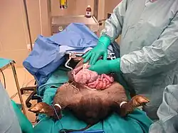 Der Colon hat bei Raubtieren, im Gegensatz zu dem des Menschen und dem von Pflanzenfressern, keine Tänien und eine glatte Oberfläche.[8] Ein Colon sigmoideum ist bei Raubtieren ebenfalls nicht ausgebildet. Das „U“ ist bei ihnen aufgrund der anderen Körperorientierung nach hinten offen.[9]