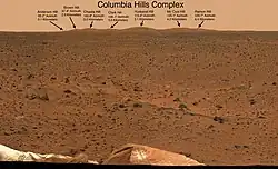 Zuerst wurden die Berge als East Hill Complex bezeichnet. Aber schon wenige Tage später benannte man sie nach dem im Jahr zuvor verunglückten Space Shuttle Columbia in Columbia Hills um, wobei sieben einzeln erkennbare Erhebungen nach jeweils einem der dabei umgekommenen Astronauten benannt wurden.