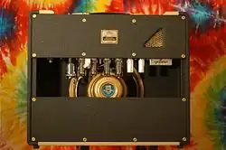 Eine wichtige Rolle bei der Klangformung von Combo-Verstärkung spielt die Gehäuserückseite. Geräte mit geschlossener Rückseite strahlen den Schalldruck der Lautsprecher konzentrierter nach vorne ab, und die tiefen Frequenzen des Klangs werden stärker betont, wogegen bei Combos mit offener oder halboffener Rückseite der Schalldruck auch nach hinten abgestrahlt wird, was einen räumlicher wirkenden und höhenreicheren Klang erzeugt.[9] Offene und halboffene Bauweise gehen auf die Frühzeit von Combos in den 1930er- bis 1950er-Jahren zurück, als viele Musiker (besonders Gitarristen, zum Beispiel in Big-Bands) bei Bühnenauftritten hinter ihrem Comboverstärker saßen. Die offene Gehäuserückseite hatte den Zweck, dass sie ihr eigenes Spiel auf dem Instrument besser hören konnten.[10] Ein nach hinten offenes Combo-Gehäuse bietet außerdem beim Transport des Geräts etwas zusätzlichen Stauraum für dessen Stromkabel sowie für kleinteiliges Instrumentenzubehör und ähnliches. Einer der bedeutendsten Hersteller von Combo-Verstärkern mit halboffener Rückwand ist die US-amerikanische Firma Fender. Die Lautsprecher in Combos sind zumeist Hochleistungs-Tieftöner, in vielen Geräten mit einem Durchmesser von etwa 25 cm (10 Zoll) oder 30 cm (12 Zoll) und mit hart aufgehängter Membran.[11]