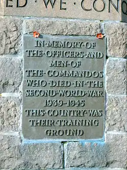 (Deutsch: „Zur Erinnerung an die Offiziere und Männer der Kommandos, die im Zweiten Weltkrieg 1939–1945 starben. Dieses Land war ihr Trainingsgelände.“)