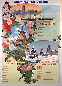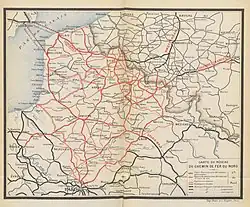 Die erste Bahnstrecke der NORD verlief 1846 vom Belgischen Bahnhof in Paris über Douai und Lille nach Calais und Dünkirchen. Weitere Strecken wurden 1847 nach Amiens, Valenciennes und zu den belgischen Städten Kortrijk und Gent angelegt. Die 1845 einer anderen Gesellschaft konzessionierte Strecke von Creil nach Saint-Quentin übernahm die NORD 1847 sowie 1852 die 123 km lange Strecke Amiens-Boulogne-sur-Mer.[2] Mit diesen Stammstrecken entstand zwischen Paris, Rouen, der Atlantikküste in der Normandie und Belgien ein ausgedehntes Netz.[3] Im Zusammenhang mit weiteren Konzessionen, die der französische Staat der NORD 1852 erteilte, wurde die Konzessionsdauer für alle ihre Strecken einheitlich auf 99 Jahre ab 1848 festgesetzt.[4]