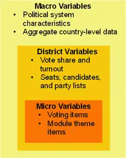 CSES Daten beinhalten Variablen auf drei Ebenen. Die erste Ebene bilden sogenannte Mikrovariablen, die die Antworten der Befragten aus den nationalen Nachwahlbefragungen enthalten. Die zweite Ebene stellen Daten über Wahlergebnisse aus den dazugehörigen Wahlbezirken der Befragten dar. Die dritte Ebene besteht aus Makrovariablen, die Informationen über den landesspezifischen Kontext, das Wahlsystem sowie Aggregatdaten wie ökonomische Indikatoren und Demokratie-Indizes enthalten. Durch diese hierarchisch geordnete Datenstruktur (s. Schaubild 1) werden Mehrebenenanalysen ermöglicht.