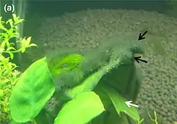 Außerdem wird ein regelmäßiger Wasserwechsel empfohlen.[1] Ggf. kann das Wasser von Algensporen durch UVC-Sterilisation entkeimt werden, indem man es durch einen UVC-Sterilisator laufen lässt (hilft auch gegen andere Algen wie Pinselalgen).[7]
