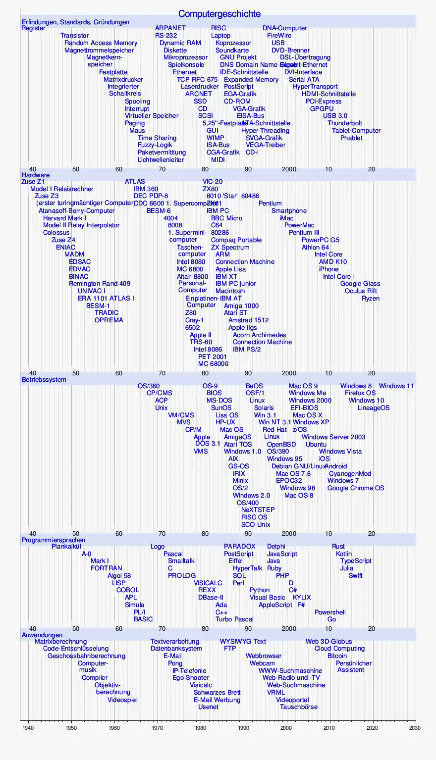 Charles Babbage und Ada Lovelace (geborene Byron) gelten durch die von Babbage 1837 entworfene Rechenmaschine Analytical Engine als Vordenker des modernen universell programmierbaren Computers. Konrad Zuse (Z3, 1941 und Z4, 1945) in Berlin, John Presper Eckert und John William Mauchly (ENIAC, 1946) bauten die ersten funktionstüchtigen Geräte dieser Art. Bei der Klassifizierung eines Geräts als universell programmierbarer Computer spielt die Turing-Vollständigkeit eine wesentliche Rolle. Sie ist benannt nach dem englischen Mathematiker Alan Turing, der 1936 das logische Modell der Turingmaschine eingeführt hatte.[1][2]