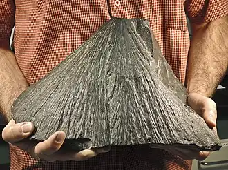 - Laut Gilman und Metzger bilden sich Cone-in-cone-Strukturen aufgrund des Wachstums von fibrösem Aragonit, der den noch plastischen Ton verdrängt.[12] Diese Deutung ist sehr ähnlich dem im vorhergehenden Punkt aufgeführten Verdrängungsmechanismus (Englisch displacive crystal growth mechanism), der jetzt allgemeine Zustimmung als Erklärungsmodell für Cone-in-cone-Strukturen zu finden scheint.