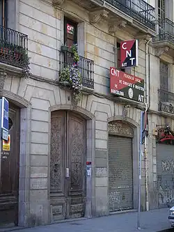 Die Confederación Nacional del Trabajo (CNT) ist eine Konföderation anarchosyndikalistischer Gewerkschaften in Spanien. Sie war mit rund 2 Millionen Mitgliedern eine der wichtigsten Protagonistinnen des Widerstandes gegen den General Francisco Franco im Spanischen Bürgerkrieg. Im Zuge dessen initiierte sie maßgeblich eine libertäre Revolution in den Regionen, in denen sie über eine entsprechende Mitgliederbasis verfügte. Nach dem Sieg Francos 1939 wurde die Organisation zerschlagen. Sie reorganisierte ihren Widerstand gegen den Franquismus im Untergrund und im Exil, letzteres vor allem in Frankreich. Nach dem Tode Francos formierte sie sich ab 1976 erneut, ohne allerdings an die vorherige Bedeutung anknüpfen zu können. 2010 hatte die CNT ca. 10.000 Mitglieder.[1]