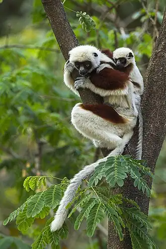 Coquerel-Sifaka, Weibchen mit Jungtier | ||||||||||||
