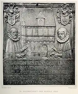 Bauinschrift der Bissendorfer Schule mit Abbildung der StifterIn und deren Wappen von „Meister H N“