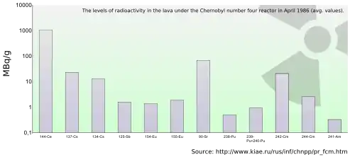 Das Corium von Tschernobyl besteht aus Urandioxid, dem Reaktorbrennstoff, seiner Umhüllung aus Zirkalloy, geschmolzenem Beton und zersetztem und geschmolzenem Serpentinit, in dem der Reaktor zur Wärmedämmung eingepackt worden war. Die Analyse ergab, dass sich das Corium auf bis zu 2255 °C erhitzte und mindestens vier Tage lang auf mehr als 1660 °C blieb.[25]