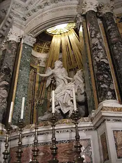 Die zentrale Figurengruppe der Transverberations-Vision[3] Verzückung der Heiligen Theresa zeigt, wie Theresa den von einem Engel abgeschossenen Pfeil im Herzen empfängt. Oft als zu erotisch kritisiert, nimmt Bernini die Visionsdarstellung der hl. Theresa wörtlich: Er stellt nicht nur den Inhalt ihrer Vision dar, sondern auch ihre Gefühle. Somit veräußert er die Innerlichkeit gleich zweimal und stellt den komplexen psychischen Ausdruck dar. Er zeigt ihren größten Schmerz und die größte Lust zugleich, welche die Heilige in ihren Lebensbeschreibungen schildert.