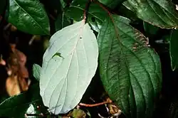 Die gegenständig an den Zweigen angeordneten Laubblätter sind in Blattstiel und Blattspreite gegliedert. Die einfache Blattspreite ist 5 bis 10 Zentimeter lang und 2,5 bis 7 Zentimeter breit. Die Blattoberseite ist mit kurzen rauen Haaren besetzt und die -unterseite ist heller und weich behaart. Die Blattadern treten auf der Blattunterseite deutlich hervor und sind zur Blattspitze hin gebogen. Im Herbst färben sich die Blätter vor dem Laubfall rot.