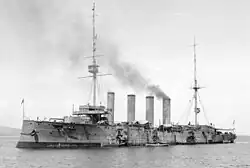 Die Hauptbewaffnung, bestehend aus vierzehn 6-Zoll-(15,2-cm)-Schnellladegeschützen, davon vier in einem Bug- und einem Heck-Doppelturm und zehn in Kasematten, war vergleichsweise schwach für einen Panzerkreuzer der damaligen Zeit. Da die unteren sechs Kasemattgeschütze nicht sehr weit über der Wasserlinie lagen, konnten sie nur bei ruhiger See wirksam eingesetzt werden. Die Panzerung war ebenfalls nicht sehr stark.