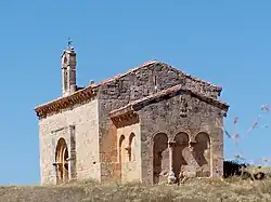 - Möglicherweise westgotische Ursprünge hat die rechteckige Apsis der Kapelle Santo Cristo de San Sebastián. Einige Steine stammen mit Sicherheit aus der Römerstadt Clunia, doch das aufgehende Bruchsteinmauerwerk des Kirchenschiffs mitsamt seinem romanischen Südportal, über welchem sich ein Glockengiebel (espadaña) erhebt, und die Konsolen- und Klötzchenfriese unterhalb der Dachtraufen sind eindeutig mittelalterlich. Nicht zu identifizieren ist eine Figur unterhalb des Giebels der Ostwand der Apsis, die ihre rechte Hand zum Gruß (oder zum Segen?) erhoben und die linke Hand in die Hüfte gestemmt hat – auch sie stammt aus dem Mittelalter. Das Innere der Apsis ist tonnengewölbt; das Kirchenschiff (nave) hat hingegen einen offenen hölzernen Dachstuhl.