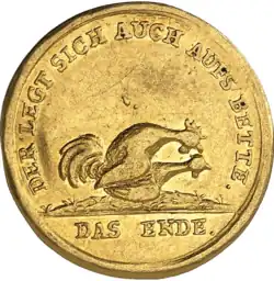 - Spieljeton in Gold (Dukaten), Amor über ein Herz auf einem Podest sitzend: WENN DV NICHT TREU etc. Rückseite Hahn, die Henne tretend. PAR COMPLAISANCE[14]
