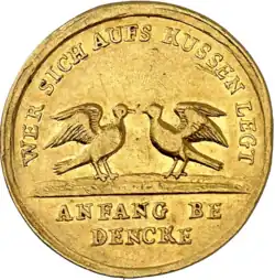 Das Prägebild der Vorderseite zeigt zwei sich schnäbelnde Tauben und die Umschrift: WER SICH AUFS KÜSSEN[12] LEGT – Im Abschnitt: ANFANG BE/DENCKE –