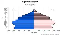 Costa Rica hatte 2022 5,2 Millionen Einwohner.[1] Das jährliche Bevölkerungswachstum betrug + 0,5 %. Zum Bevölkerungswachstum trug ein Geburtenüberschuss (Geburtenziffer: 11,7 pro 1000 Einwohner[20] vs. Sterbeziffer: 7,1 pro 1000 Einwohner[21]) bei. Die Anzahl der Geburten pro Frau lag 2022 statistisch bei 1,5, die der Region Lateinamerika und die Karibik betrug 1,8.[22] Der Median des Alters der Bevölkerung lag im Jahr 2021 bei 32,9 Jahren.[23] Im Jahr 2023 waren 19,8 Prozent der Bevölkerung unter 15 Jahre,[24] während der Anteil der über 64-Jährigen 11,2 Prozent der Bevölkerung betrug.[25]