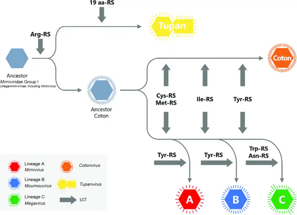 In einem proteomischen Stammbaum ist dieses neue NCLDV phylogenetisch an der Wurzel von drei Linien A, B und C der Mimiviridae-Gruppe I (Mimivirus, Moumouvirus respektive Megavirus) angesiedelt (basal).[4]
