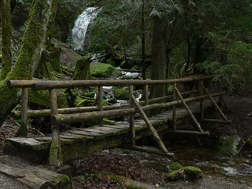 Die Brücke am Fuß der Coal Creek Falls mit dem Wasserfall im Hintergrund