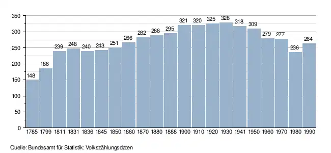 - ↑ Daten der Eidgenössischen Volkszählungen ab 1850 nach Gemeinden. (XLSX; 10 MB) Bundesamt für Statistik, Neuchâtel, 12. Juli 2024, abgerufen am 22. Mai 2025 (Öffnung in Excel nur über "Anhang/Excel-Datensatz" möglich).