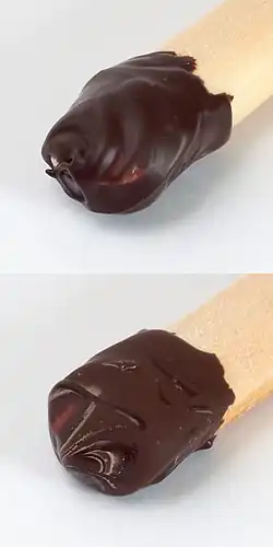 - ↑ a b Schokoladenüberzugsmassen und Fettglasuren. (wissensforum-backwaren.de, PDF-Datei; 221 kB)