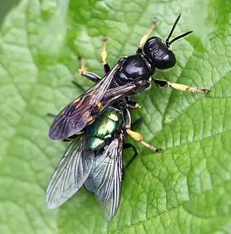 Grabwespe der Gattung Crabro mit erbeuteter Fliege | ||||||||||||