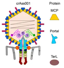 Dieser erste kultivierte Vertreter (Bacteroides-Phage crAss001, ΦcrAss001, Familie Steigviridae) hat eine Podoviren-Morphologie,[9] aber im Gegensatz zu den damals bekannten Podoviren kein lineares, sondern ein zirkuläres Doppelstrang-DNA-Genom mit einer Größe von etwa 97 kbp (Kilo-Basenpaaren) und enthält nach Vorhersage 80 offene Leserahmen (englischOpen reading Frames, ORFs).[6][5]
