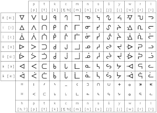 Die meisten Dialekte werden mit nur zwölf Grundzeichen geschrieben, die je nach Vokal der Silbe in vier Richtungen gedreht werden.[1]