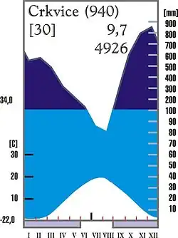 Quelle: «Klima von Crkvice (1960-1991)», Seite des Hydrometeorologischen Instituts Montenegro