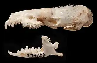 Der Schädel hat eine Gesamtlänge von 15 bis 17 Millimetern. Wie alle Arten der Gattung besitzt die Art im Oberkiefer pro Hälfte einen Schneidezahn (Incisivus) und danach drei einspitzige Zähne, einen Prämolaren und drei Molaren. Im Unterkiefer besitzt sie dagegen einen einzelnen Eckzahn (Caninus) hinter dem Schneidezahn. Insgesamt verfügen die Tiere damit über ein Gebiss aus 28 Zähnen. Die Zahnwurzeln sind wie bei allen Weißzahnspitzmäusen im Gegensatz zu denen der Rotzahnspitzmäuse nicht pigmentiert.[1]