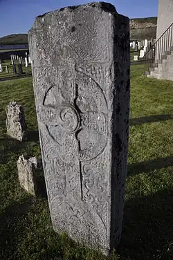 Von der dreifachen Spirale im Schnittpunkt der Kreuzbalken breitet sich die Verzierung in swastikaartigem Muster auf den anschließenden Bereich der Arme des Kreuzes aus. Endloses Knotwerk füllt den Rest des Kreuzes und den übrigen Stein. Der Bogen an der Basis des Kreuzes entspricht irischer Tradition, das Kreuz auf eine massive Basis zu stellen, die stilistisch gesehen einen Hügel darstellt, der hier mit einem Paar verflochtener Vögel besetzt ist.