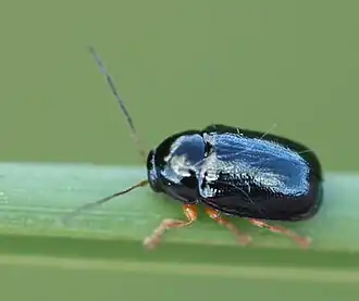 Die Käfer erreichen eine Körperlänge von 3–4,5 mm.[1][2] Sie besitzen eine blauschwarze Grundfarbe mit Metallschimmer. Der Vorderkopf oberhalb des pechschwarzen Munds bis an die Facettenaugen heranreichend ist gelb. Die etwa vier basalen Fühlerglieder sind gelb, die restlichen sind verdunkelt. Die Käferart weist einen Geschlechtsdimorphismus auf. Die Männchen besitzen an der Innenseite der Augen oberhalb des Fühleransatzes jeweils einen kleinen gelben Fleck. Ihre mittleren und hinteren Beine sind schwarz, die vorderen Femora sind teils verdunkelt, ansonsten sind die vorderen Beine gelb. Bei den Weibchen sind alle Beine vollständig gelb gefärbt. Die Mandibeln sind bei beiden Geschlechtern gelb. Die Elytren weisen in den meisten Fällen regelmäßige Punktstreifen auf.[1][2] Die Fühler sind bei den Männchen etwa so lang wie ihre Körpergröße, bei den Weibchen sind diese deutlich kürzer.